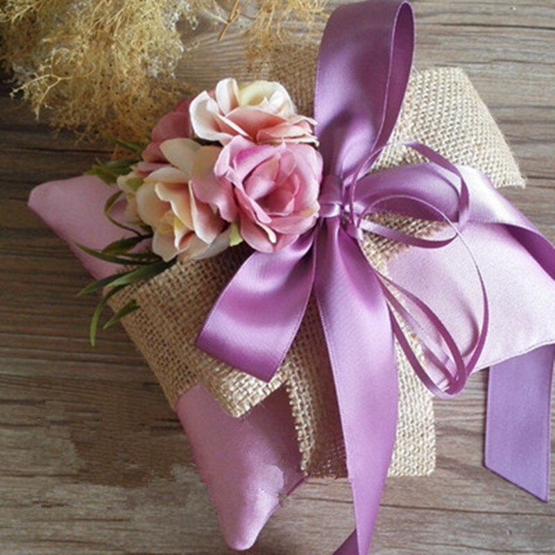 Coussin d'alliance en toile de juste et satin destiné à offrir à l’amour de votre vie. Rajoutez une touche d’authenticité au moment le plus important de votre cérémonie avec cet oreiller d'anneau à la fois Naturel et Elégant.